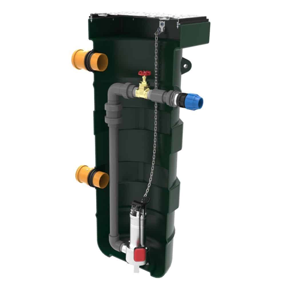 Harlequin 450 litre “Mini” Pump Station is designed to pump from small additional extensions or living spaces where additional pipework is required to join these living spaces to the existing home drainage system, but a pumping station is required as the pipework lacks the drainage fall required.