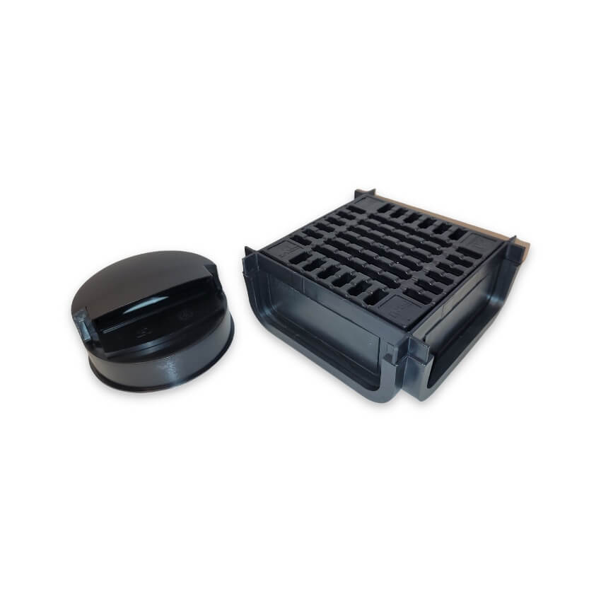 Lite Aqua corner Ultra Shallow channel drain corner quad box for use with channel drain lengths, for neat application for change of direction, capable of taking a load of 1.5ton, for use in driveway and all domestic applications, low depth for difficult to install areas, ideal for garden and pathway use requiring reduced digging and easy to clip together.